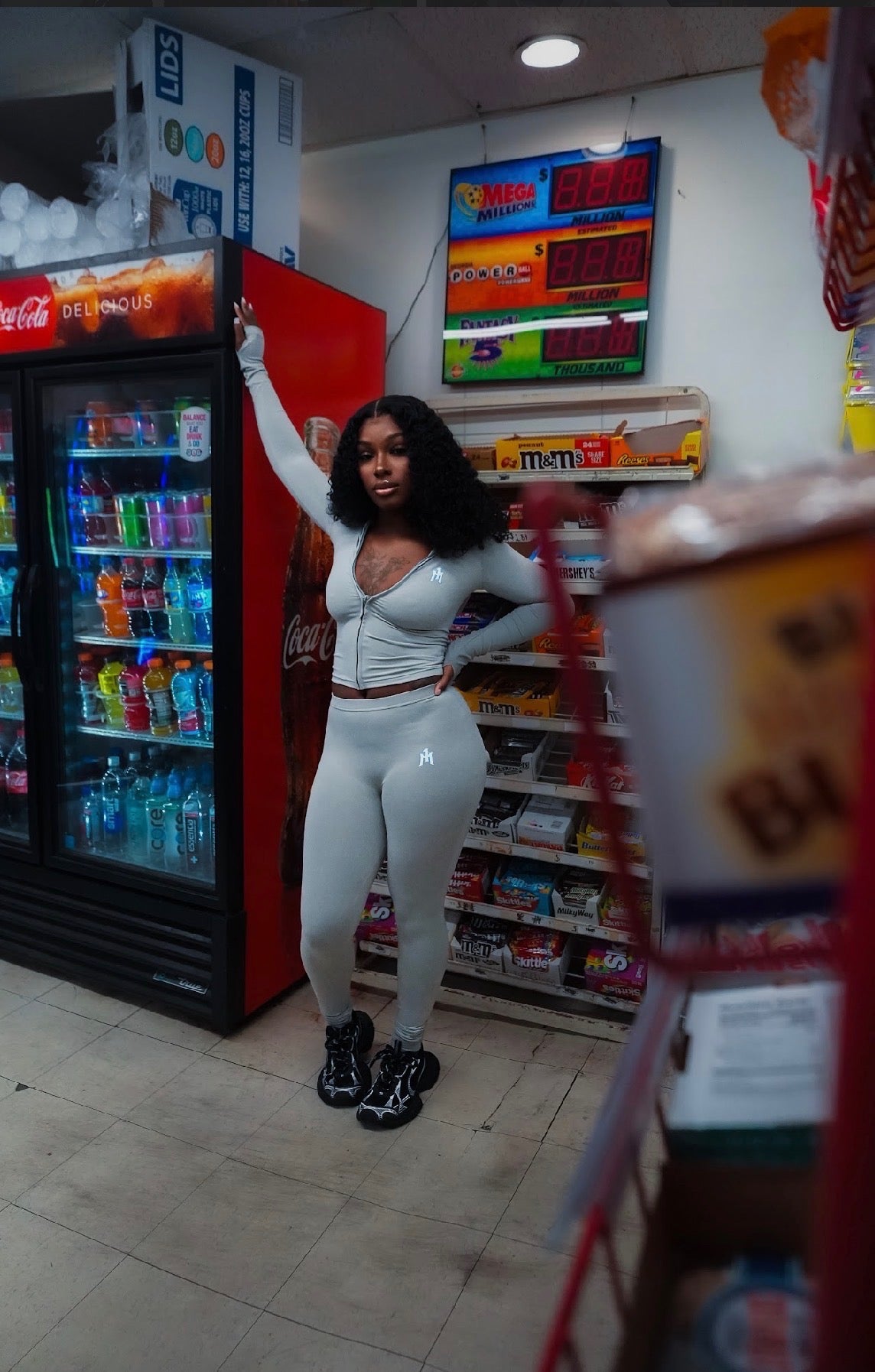 Crafted in a cool grey with a blue and white logo, this set symbolizes balance, clarity, and confidence. It’s premium fabric provides smoothing, sculpting, and supports you through every motion.