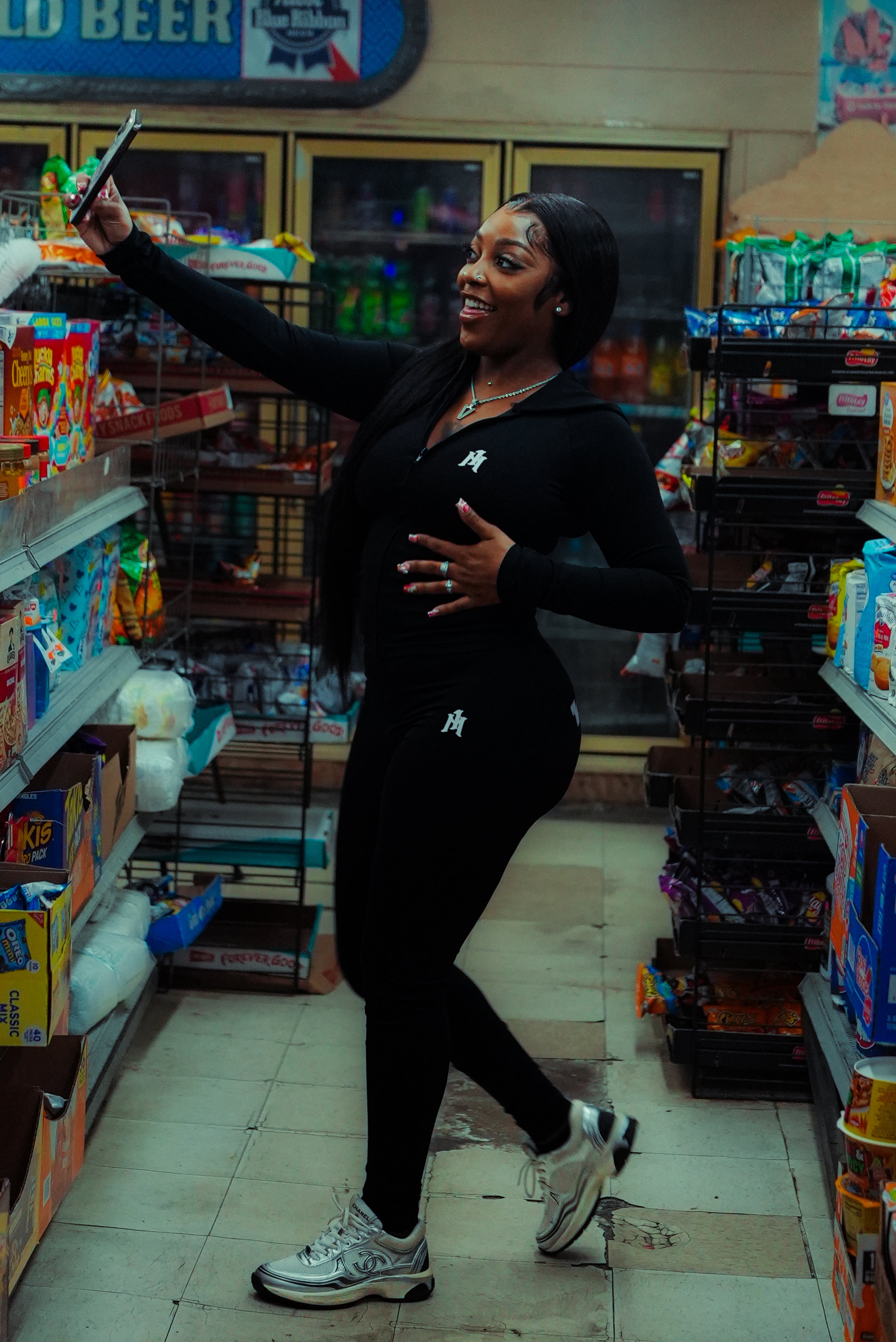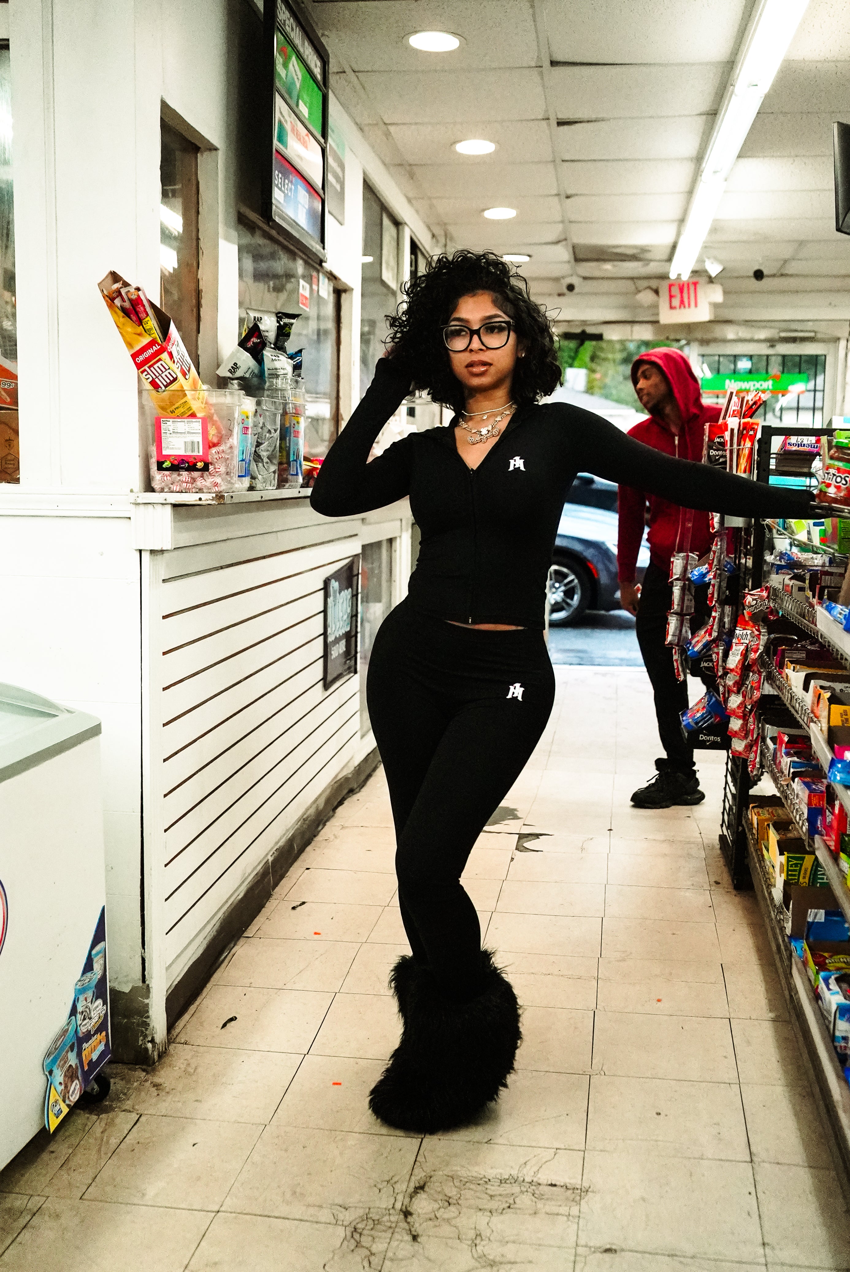 Inspired by the balance of boldness and grace, this sleek black set features a signature pink and white 1M logo on jacket and 1Million on the back of leggings. symbolizing feminine energy and unstoppable confidence.